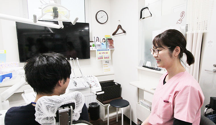 患者さまのお悩みやご希望について詳しく伺います。当院スタッフからも、患者さまの歯がなくなった時期や原因、ご予算のご希望があるかなどについてお伺いさせていただきます。また、患者さまの口腔内を拝見するなどし、どのような治療方法が考えられるかお話しします。初めてお越しいただいた患者さまが落ち着いてお話しできるよう、丁寧なコミュニケーションを心がけています。